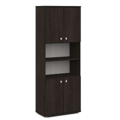 Полуоткрытый шкаф для документов V-605 с 5 полками. Состав: V-67 + V-010 + V-010. Верхний топ и низ стеллажа выполнены из плиты толщиной 25 мм. Кромка по переднему торцу верхнего топа и низа - ПВХ 2 мм. Кромки остальных срезов - ПВХ 0,4 мм. Боковые стенки выполнены из ЛДСП толщиной 16 мм. Задняя стенка выполнена из ХДФ толщиной 3 мм, облицованного с одной стороны цветом "Орех Вирджиния". Состоит из 2-х частей, соединенных пластмассовой планкой. Шкаф имеет 5 полок и 6 пролетов. Полки расположены на расстоянии 341 мм от верхнего и от нижнего топа. Расстояние между полками - 327 мм. Полки опорные (горизонтали) 4 штуки, выполнены из ЛДСП толщиной 25 мм. Размеры: ширина 786 мм, глубина 420 мм. Средняя полка съемная. В качестве крепежной фурнитуры используются эксцентриковые стяжки, позволяющие многократно собирать и разбирать мебель без потери жесткости соединений и исключающие отверстия на лицевых поверхностях. Эксцентрики закрываются заглушками в цвет плиты. Шкаф оборудован четырьмя регулируемыми по высоте пластиковыми опорами серого цвета, диаметром 50 мм, высотой 27 мм, позволяющими компенсировать неровности пола. Регулировка ±10 мм. Материал опор - пластик серый. V-010: Двери распашные, низкие. Фасады выполнены из плиты толщиной 16 мм, высота - 702 мм, крепление на 2-х петлях. Ручка – кнопка с поднимающимся язычком, размером 15 мм х 30 мм. Материал - цинковое литье. Цвет - "Хром матовый". Цвета: Орех Вирджиния, Дуб Кентербери, Дуб Кобург, Дуб Кобург/ Металл.