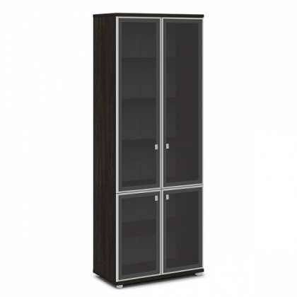 Верхний топ и низ стеллажа выполнены из плиты толщиной 25 мм. Кромка по переднему торцу верхнего топа и низа - ПВХ 2 мм. Кромки остальных срезов - ПВХ 0,4 мм. Боковые стенки выполнены из ЛДСП толщиной 16 мм. Задняя стенка выполнена из ХДФ толщиной 3 мм, облицованного с одной стороны облицована цветом "Орех Вирджиния". Состоит из 2-х частей, соединенных пластмассовой планкой. Имеет 5 полок и 6 пролетов. Полки расположены на расстоянии 341 мм от верхнего и от нижнего топа. Расстояние между полками - 327 мм. Полки опорные (горизонтали) 4 штуки, выполнены из ЛДСП толщиной 25 мм. Размеры: ширина 786 мм, глубина 420 мм. Средняя полка съемная. В качестве крепежной фурнитуры используются эксцентриковые стяжки, позволяющие многократно собирать и разбирать мебель без потери жесткости соединений и исключающие отверстия на лицевых поверхностях. Эксцентрики закрываются заглушками в цвет плиты. Шкаф оборудован четырьмя регулируемыми по высоте пластиковыми опорами серого цвета, диаметром 50 мм, высотой 27 мм, позволяющими компенсировать неровности пола. Регулировка ±10 мм. Материал опор - пластик серый. Двери стеклянные, распашные, средние. В комплекте 2 шт. Фасады в алюминиевом профиле толщиной 20 мм. Толщина стекла - 4 мм. Высота - 1406 мм, крепление на 3-х петлях. Стекло тонированное. Ручка – кнопка с поднимающимся язычком, размером 15 мм х 30 мм. Материал - цинковое литье. Цвет - "Хром матовый". В комплекте - 2 шт. Двери стеклянные, распашные, низкие. В комплекте 2 шт. Фасады в алюминиевом профиле толщиной 20 мм. Толщина стекла - 4 мм. Высота - 702 мм, крепление на 2-х петлях. Стекло тонированное. Ручка – кнопка с поднимающимся язычком, размером 15 мм х 30 мм. Материал - цинковое литье. Цвет - "Хром матовый". В комплекте - 2 шт. Цвета: Орех Вирджиния, Дуб Кентербери, Дуб Кобург, Дуб Кобург/ Металл.
