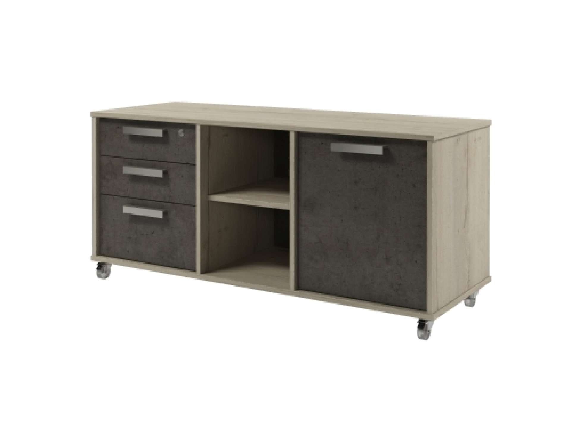 Тумба греденция, 3 ящика, ниша и дверь. Каркас тумбы выполнен из ЛДСП 18 мм, кромка ABS 2 мм. Фасады из ЛДСП 18 мм Бетон Чикаго, кромка ABS 2 мм. Ящики со стильными металлическими боковинами производства Hettich и системой плавного закрывания с доводчиками. Ручки металлические с межцентровым расстоянием 320 мм, цвет "нержавеющая сталь". На двери петли с доводчиком. Колесные опоры из прозрачного силикона. Цвета: Дуб Галифакс / Бетон Чикаго, Сосна Пасадена / Бетон Чикаго.
