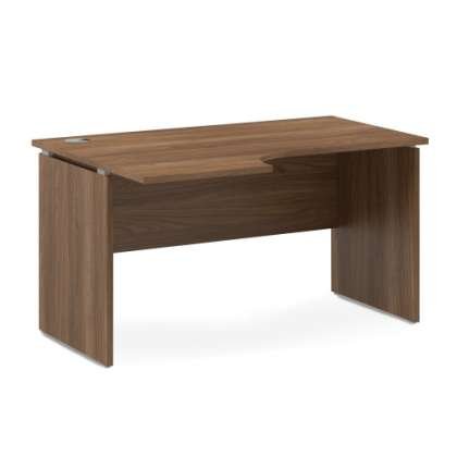 Стол письменный, эргономичный. С заглушкой кабель-канала. Левое исполнение. Каркас стола изготовлен из ЛДСП в цвете "Орех Вирджиния", облицован противоударной кромкой ПВХ 2 мм и 0,4 мм. Столешницы и боковины столов изготовлены из ЛДСП 25 мм, соединительный щит - из ЛДСП 16 мм. Между опорами и столешницей зазор, образованный пластиковыми проставками серого цвета, размером: длина 64 мм, ширина 20 мм, высота 22 мм. Заглушка кабель-канала выполнена из пластика серого цвета с черным. Диаметр отверстия - 80 мм. Опоры: регулируемые, серый пластик. Диаметр 25 мм, высота 8 мм. Регулировка ±10 мм. Возможна установка как отдельно, так и с тумбами V-231, V-232, V-233. Цвета: Орех Вирджиния, Дуб Кентербери, Дуб Кобург.