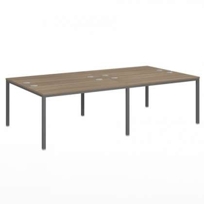 Каждая столешница укомплектована 2 заглушками кабель-канала диаметром 80 мм, производства компании "Aza plastici" (Италия). Расстояние между столешницами - 32 мм под установку экранов или декоративных заглушек. Металлокаркас представляет собой разборную конструкцию, состоящую из опор и траверс, стянутых между собой крепежными узлами. Профильное сечение опоры 40х40, траверсы 30х30 мм. Траверсы расположены по периметру и по центру металлокаркаса, свес 8 мм. Две пары рабочих мест имеют общие траверсу и центральные опоры. Высота каркаса (до нижней плоскости столешницы) — 725 мм. Опоры плотно прилегают к столешнице. Регулируемая опора, с регулировкой до 10 мм. Цвет металлокаркаса (окрашен порошковой краской): серый, текстура поверхности – муар. Поставляется в разобранном виде. Цвета столешницы: Орех Вирджиния, Дуб Кентербери, Дуб Кобург.