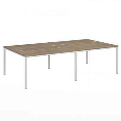 Каждая столешница укомплектована 2 заглушками кабель-канала диаметром 80 мм, производства компании "Aza plastici" (Италия). Расстояние между столешницами - 32 мм под установку экранов или декоративных заглушек. Металлокаркас представляет собой разборную конструкцию, состоящую из опор и траверс, стянутых между собой крепежными узлами. Профильное сечение опоры 40х40, траверсы 30х30 мм. Траверсы расположены по периметру и по центру металлокаркаса, свес 8 мм. Две пары рабочих мест имеют общие траверсу и центральные опоры. Высота каркаса (до нижней плоскости столешницы) — 725 мм. Опоры плотно прилегают к столешнице. Регулируемая опора, с регулировкой до 10 мм. Цвет металлокаркаса (окрашен порошковой краской): белый, текстура поверхности – муар. Поставляется в разобранном виде. Цвета столешницы: Орех Вирджиния, Дуб Кентербери, Дуб Кобург.